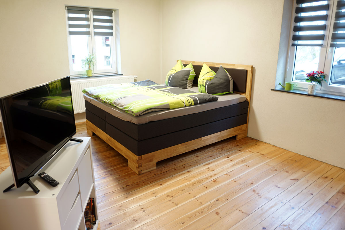 Gemütlicher Wohn-Schlafraum mit großem Boxspringbett. Eine bequeme Sitzgelegenheit lädt zum Verweilen ein. Das eigene Badezimmer mit Dusche / WC bietet ausreichend Platz zum Wohlfühlen. Bettwäsche und Handtücher werden gestellt. Kostenloses W-Lan und ein Flachbildfernseher gehören ebenfalls zur Ausstattung.